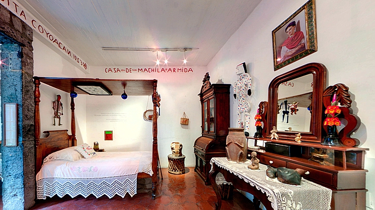 6 de julio de 2020 (11:19 hrs.) - Hoy se cumplen 113 años del nacimiento de Frida Kahlo, una mujer marcada desde joven por un terrible accidente que le dejó graves secuelas físicas, pero también por su amor por la vida, por el arte, las tradiciones mexicanas, la política y por la tormentosa relación que mantuvo con su marido, el pintor Diego Rivera. Frida nació en la casa que hoy alberga el museo a ella dedicado, mundialmente conocido como “La Casa Azul”, uno de las más visitados en la Ciudad de México. La residencia fue construida en 1904 por su padre, Carl Wilhelm Kahl —un migrante alemán cuyo nombre fue posteriormente castellanizado y transformado en Guillermo Kahlo— y se ubica en la esquina de las calles de Londres y Allende en en el barrio de Coyoacán. El diseño arquitectónico es de una planta cuadrada con patio central, alrededor del cual se encuentran ubicadas las habitaciones. La casa fue habitada por la familia de Frida y por Diego Rivera. El actual museo cuenta con una gran recopilación de piezas prehispánicas, fotografías y documentos que estuvieron catalogándose por años y puede ser visitado a través de un recorrido virtual, accesible en el siguiente link: https://www.recorridosvirtuales.com/frida_kahlo/museo_frida_kahlo.html Casa Azul - Recámara de noche. Haz clic en la imagen para iniciar el recorrido virtual (puntodincontro.mx)