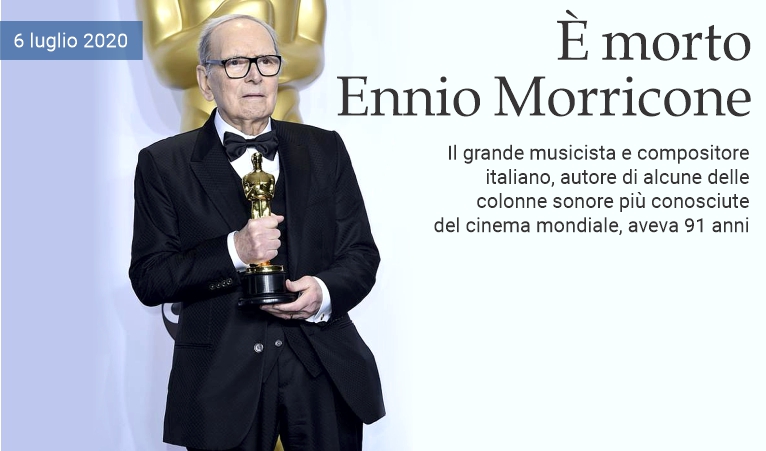 6 luglio 2020 (ore 3:18) - È morto nella notte in una clinica romana per le conseguenze di una caduta il premio Oscar Ennio Morricone. Il grande musicista e compositore, autore delle colonne sonore più belle del cinema italiano e mondiale —tra cui Per un pugno di dollari, Mission, C'era una volta in America, Nuovo cinema Paradiso e Malena— aveva 91 anni. Qualche giorno fa si era rotto il femore. I funerali si terranno in forma privata «nel rispetto del sentimento di umiltà che ha sempre ispirato gli atti della sua esistenza». Lo ha annunciato la famiglia attraverso l'amico e legale Giorgio Assumma. Morricone, si legge nella nota, si è spento «all'alba del 6 luglio in Roma con il conforto della fede». Assumma aggiunge che il maestro «ha conservato sino all'ultimo piena lucidità e grande dignità». Il ministro degli Esteri del Messico, Marcelo Ebrard, ha scritto sul suo account Twitter: «Mi rattristisce la morte di Ennio Morricone, un prolifico e talentuoso compositore che ha realizzato ottimi film con la sua musica. Riposi in pace».