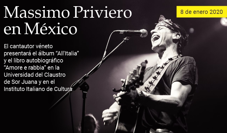 8 de enero de 2019 - El cantante y compositor italiano Massimo Priviero estará en la Ciudad de México en los próximos días para presentar su trabajo discográfico más reciente All'Italia y el libro autobiográfico Amore e rabbia. Después de un primer concierto en la Universidad del Claustro de Sor Juana el 21 de enero, el artista véneto se presentará en el Instituto Italiano de Cultura de Coyoacán el día 23 a las 20:00 hrs. La entrada será libre.