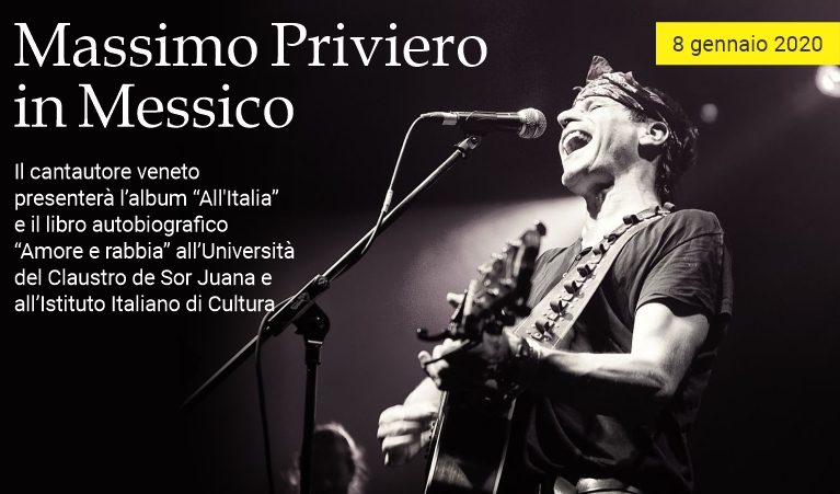 8 gennaio 2020 - Il cantautore italiano Massimo Priviero sarà a Città del Messico nei prossimi giorni per presentare il suo più recente lavoro discografico All'Italia e il libro autobiografico Amore e rabbia. Dopo un primo concerto all'Università del Claustro de Sor Juana il 21 gennaio, l'artista veneto sarà all'Istituto Italiano di Cultura di Coyoacán il giorno 23 alle ore 20:00. L'ingresso sarà libero.