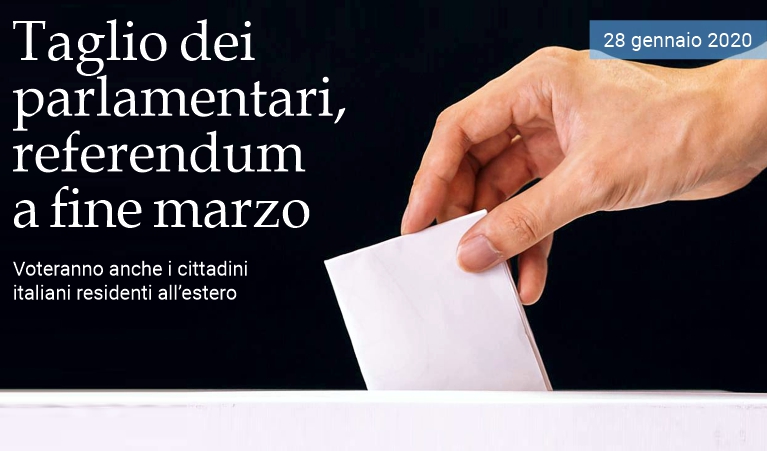 28 gennaio 2020 - Il Consiglio dei ministri, su proposta del presidente Giuseppe Conte, ha convenuto sulla data di domenica 29 marzo per l'indizione —che verrà ufficializzata da un decreto del presidente della Repubblica— del referendum popolare sul testo di legge costituzionale che riduce il numero dei parlamentari. Dopo le 71 firme raccolte in Senato, lo scorso 23 gennaio era giunto il semaforo verde della Corte di Cassazione. Alla consultazione parteciperanno anche gli italiani residenti all'estero. È probabile che nelle modalità che diffonderà il ministero degli Affari esteri si indichi che i voti dei maggiorenni iscritti all'AIRE dovranno pervenire all'ufficio consolare competente entro le ore 16 di giovedì 26 marzo. (massimo barzizza / puntodincontro.mx)