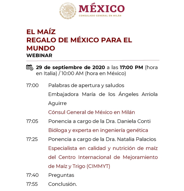 27 de septiembre de 2020 (4:55 hrs.) - En ocasión del Día Nacional del Maíz, que se celebrará el 29 de septiembre, el Consulado General de México en Milán organiza el webinar “El maíz, regalo de México para el mundo”, que se llevará a cabo en esa misma fecha a las 17:00 (hora de Italia, las 10:00 hora del centro de México). El evento, que durará una hora, tendrá lugar vía Zoom y contará con la participación de la Cónsul General, Embajadora María de los Ángeles Arriola Aguirre, y las intervenciones de la Dra. Daniela Conti, bióloga italiana experta en ingeniería genética, y de la Dra. Natalia Palacios, especialista en calidad y nutrición de maíz del Centro Internacional de Mejoramiento de Maíz y Trigo (CIMMYT). Las investigadoras describirán la importancia del maíz, su impacto en los ámbitos ecológico y social en las comunidades en las que se cultiva, el proceso de nixtamalización, los usos y su sostenibilidad. Para asistir al webinar es necesario enviar un correo electrónico a infomil@sre.gob.mx. El Día Nacional del Maíz fue instituido por el Congreso mexicano en 2019. El dictamen que acompaña la resolución refiere que México ocupa el quinto lugar mundial de producción de este grano, del cual oferta el 2.2 por ciento, con 21.6 millones de toneladas y una tasa de crecimiento anual de 2.0 por ciento. Se precisa, además, que el 57 por ciento de la producción total del país es destinado al consumo humano, el 29 por ciento al consumo animal y el 20 por ciento a la industria. Los principales Estados productores son Sinaloa (26%), Jalisco (12.6%), Estado de México (6.5%), Chiapas (6.0%), Michoacán (5.9%) y Veracruz (5.7%).
