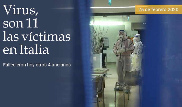 25 de febrero de 2020 (16:13 hrs.) - Hasta el momento se han confirmado 11 víctimas de coronavirus en Italia. Los últimos cuatro fallecidos son un hombre de 84 años de Nembro, en la provincia de Bérgamo, un hombre de 91 años de San Fiorano, una mujer de 83 años de Codogno, ambos en la provincia de Lodi, y una mujer de 76 años que había sido hospitalizada en cuidados intensivos en Treviso por complicaciones respiratorias. Según lo informado por el comisionado extraordinario Angelo Borrelli durante la conferencia de prensa sobre protección civil, hay 322 personas contagiadas en Italia, incluidos tres en Sicilia. «En Italia la población es anciana y esto explica las tasas de mortalidad del 2-3%. Los ancianos son más frágiles, lo vemos con la influenza. De esta última podemos protegerlos con la vacuna. Como no hay vacuna para el coronavirus, hay mortalidad. La única forma de protegerlos es limitar los brotes, como se está haciendo». Lo afirmó Giovanni Rezza, director del departamento de enfermedades infecciosas del Istituto Superiore di Sanità en una conferencia de prensa sobre Protección Civil. (massimo barzizza / puntodincontro.mx)