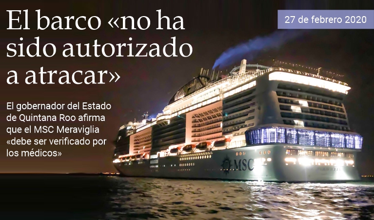 27 de febrero de 2020 (01:47 hrs.) - El gobernador del Estado mexicano de Quintana Roo, Carlos Joaquín González, informó esta noche que el crucero Meravigilia de MCS, «no ha sido autorizado a atracar en Cozumel» y condicionó el permiso a los resultados de una revisión de autoridades de sanidad internacional. En su cuenta de Twitter, Joaquín confirmó que el barco de la naviera Mediterranean Shipping Company (MCS) se encuentra anclado frente a las costas de Cozumel y «deberá ser revisado por los médicos de Sanidad Internacional, quienes verificarán los temas de salud a bordo». (massimo barzizza / puntodincontro.mx)