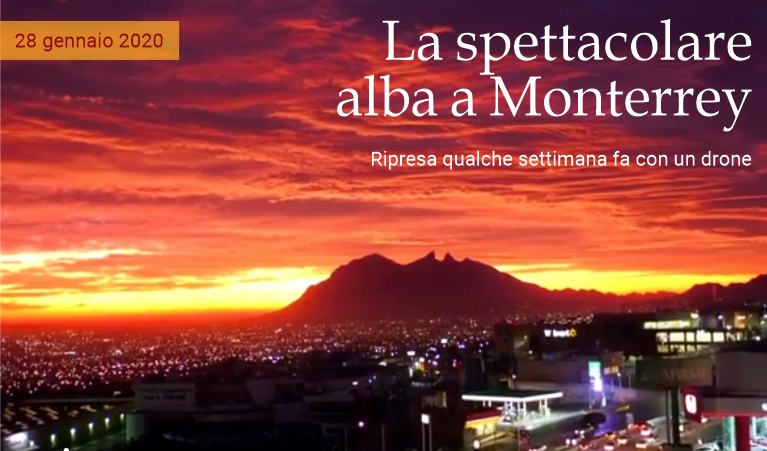 28 gennaio 2020 - Un fenomeno della natura ricco di forza e simbolo di vitalità: questa spettacolare alba è stata ripresa qualche settimana fa con un drone a Monterrey, in Messico e pubblicata ieri dal quotidiano italiano Il Corriere della Sera. La città —situata nella zona settentrionale del Paese— è ricca di paesaggi spettacolari, aree verdi, monumenti storici, numerosi musei e scenari montani, come il Cerro de la Silla e il Cerro de las Mitras. E poi c’è la Sierra Madre, una catena montuosa di circa 1.350 chilometri di lunghezza che corre da nord-ovest a sud-est, con paesaggi incontaminati e acque termali. A Monterrey si trova anche la libreria Conarte, considerata una delle più belle del mondo.