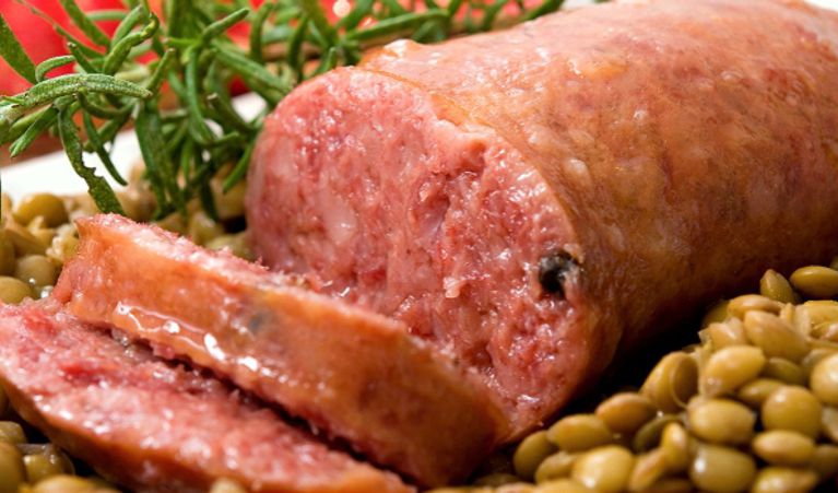 Preparación Remojen las lentejas en agua fría. Mientras tanto, sofrían el aceite de oliva, la cebolla finamente picada y el ajo. A continuación, escurran y añadan las lentejas, la pulpa de jitomate y la hoja de laurel. Añadan sal al gusto y dejen cocer durante unos diez minutos. Agreguen abundante agua hirviendo y cuezan a fuego moderado hasta que las lentejas alcancen la consistencia deseada. Mientras tanto pongan a hervir el cotechino siguiendo las instrucciones de la envoltura del producto. Cuando esté listo, retírenlo del caldo, rebánenlo y colóquelo en un plato para servir rodeado de lentejas. Es importante servir el cotechino con lentejas muy caliente.